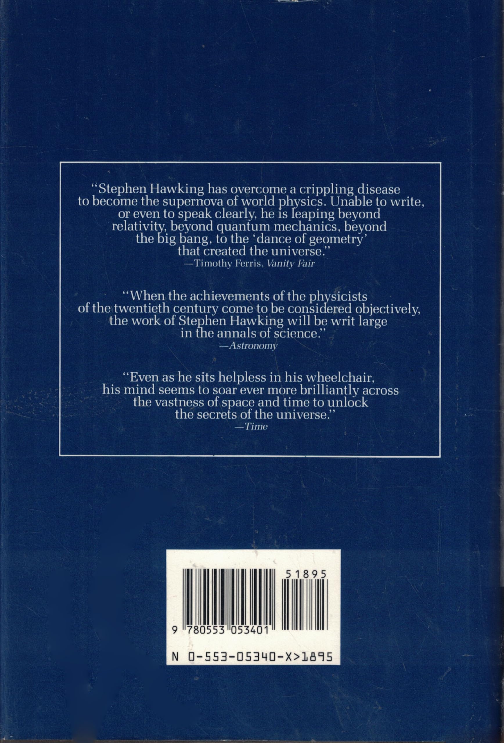 Stephen Hawking has earned a reputation as the most brilliant theoretical physicist since Einstein. In this landmark volume, Professor Hawking shares his blazing intellect with nonscientists everywhere, guiding us expertly to confront the supreme questions of the nature of time and the universe. Was there a beginning of time? Will there be an end? Is the universe infinite or does it have boundaries? From Galileo and Newton to modern astrophysics, from the breathtakingly cast to the extraordinarily tiny, Professor Hawking leads us on an exhilarating journey to distant galaxies, black holes, alternate dimensions--as close as man has ever ventured to the mind of God. From the vantage point of the wheelchair from which he has spent more than twenty years trapped by Lou Gehrig's disease, Stephen Hawking has transformed our view of the universe. Cogently explained, passionately revealed, A Brief History of Time is the story of the ultimate quest for knowledge: the ongoing search for the tantalizing secrets at the heart of time and space., ISBN13:9780553053401 ISBN10:055305340X Material Type:hardcover