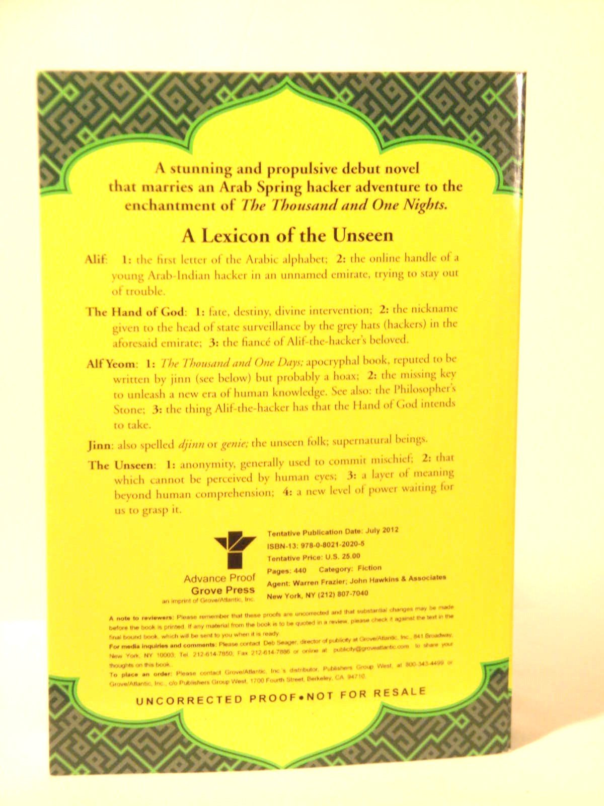 In an unnamed Middle Eastern security state, a young Arab-Indian hacker shields his clients—dissidents, outlaws, Islamists, and other watched groups—from surveillance and tries to stay out of trouble. He goes by Alif—the first letter of the Arabic alphabet, and a convenient handle to hide behind. The aristocratic woman Alif loves has jilted him for a prince chosen by her parents, and his computer has just been breached by the State’s electronic security force, putting his clients and his own neck on the line. Then it turns out his lover’s new fiancé is the head of State security, and his henchmen come after Alif, driving him underground. When Alif discovers The Thousand and One Days, the secret book of the jinn, which both he and the Hand suspect may unleash a new level of information technology, the stakes are raised and Alif must struggle for life or death, aided by forces seen and unseen. With shades of Neal Stephenson, Neil Gaiman, Philip Pullman, and The Thousand and One Nights, Alif the Unseen is a tour de force debut—a sophisticated melting pot of ideas, philosophy, religion, technology and spirituality smuggled inside an irresistible page-turner., ISBN13:9780802120205 ISBN10:0802120202 Material Type:hardcover
