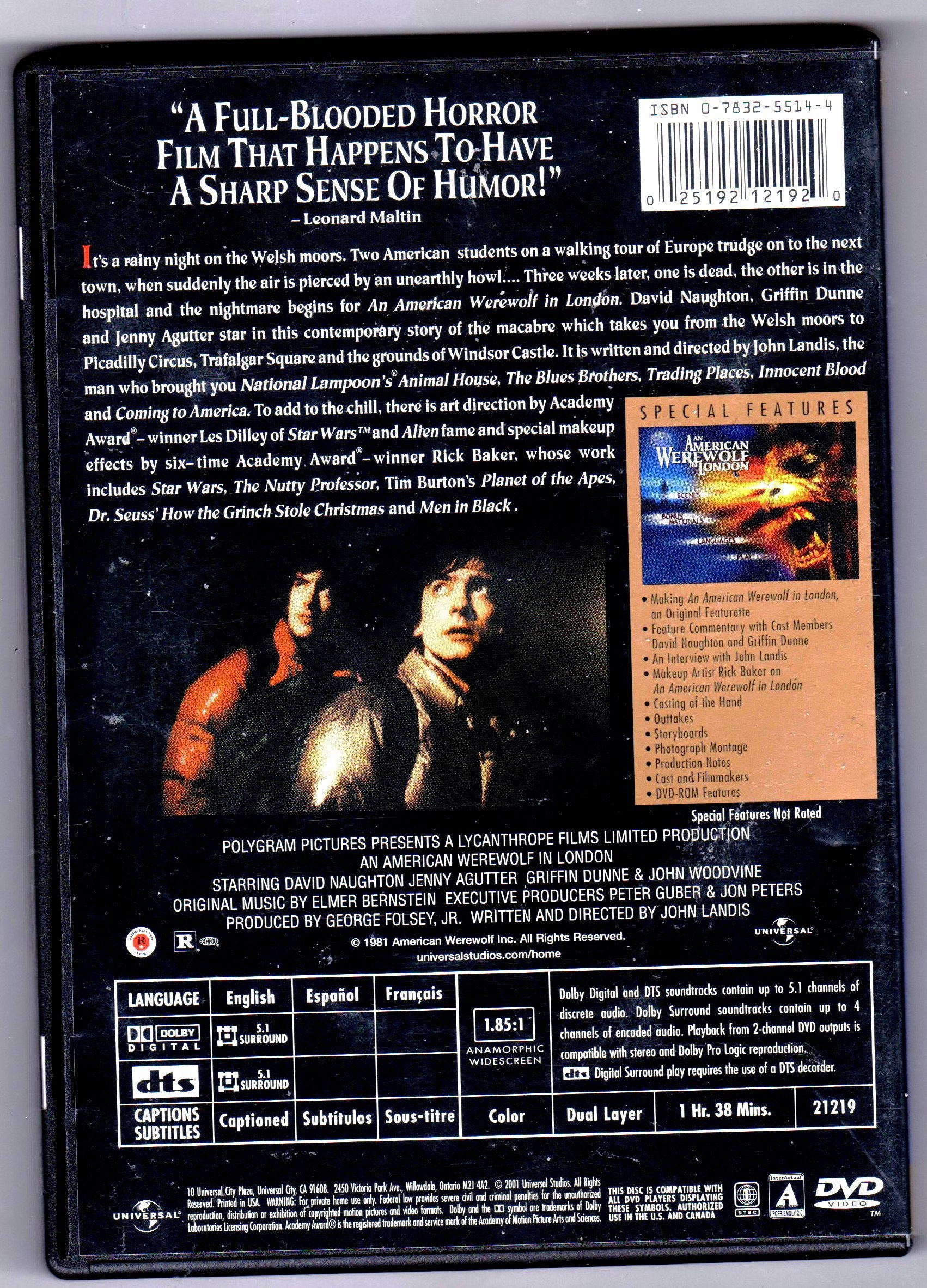 Making An American Werewolf in London Feature Commentary with Cast Members David Naughton and Griffin Dunne An Interview with John Landis Makeup Artist Rick Baker on An American Werewolf in London Casting of the Hand Outtakes Storyboards Photograph Montage Production Notes Cast and Filmmakers DVD-ROM Features, ISBN13:B00005LC4E ISBN10:B00005LC4E Material Type:dvd