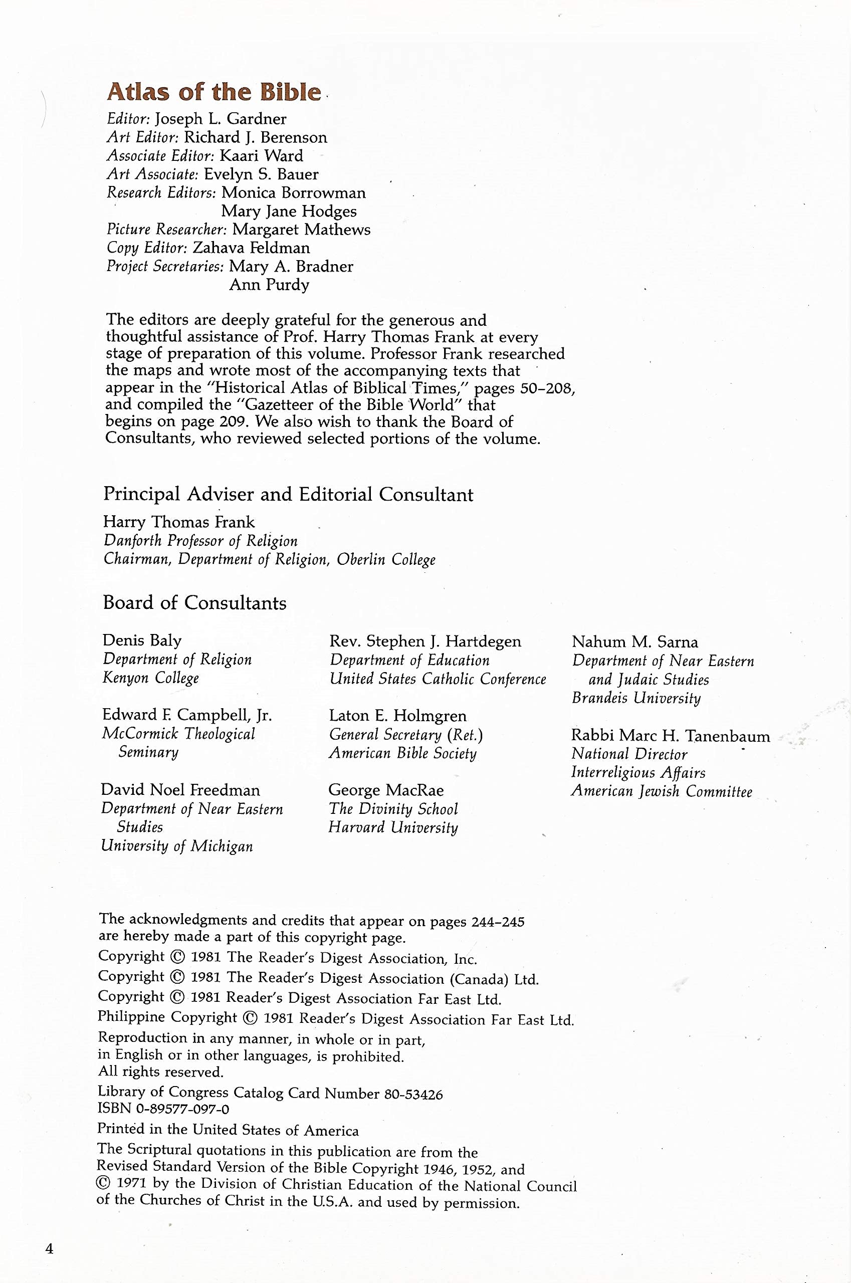 The world's most enduring work of faith and wisdom, the Bible also tells the story of great people moving through a land starkly, awesomely beautiful. Abraham travels from "Ur of the Chaldeans" down to the land of Cannan; David flees the wrath of Saul in the Wilderness of Judea; Jesus gathers his "fishers of men" on the shores of the Sea of Galilee. To provide a deeper understanding of the Bible's immortal stories, Reader's Digest has sought to place them in their proper geographical and historical context. The result, "Atlas of the Bible," is a unique reference work and a fascinating reading experience., ISBN13:9780895770974 ISBN10:0895770970 Material Type:hardcover