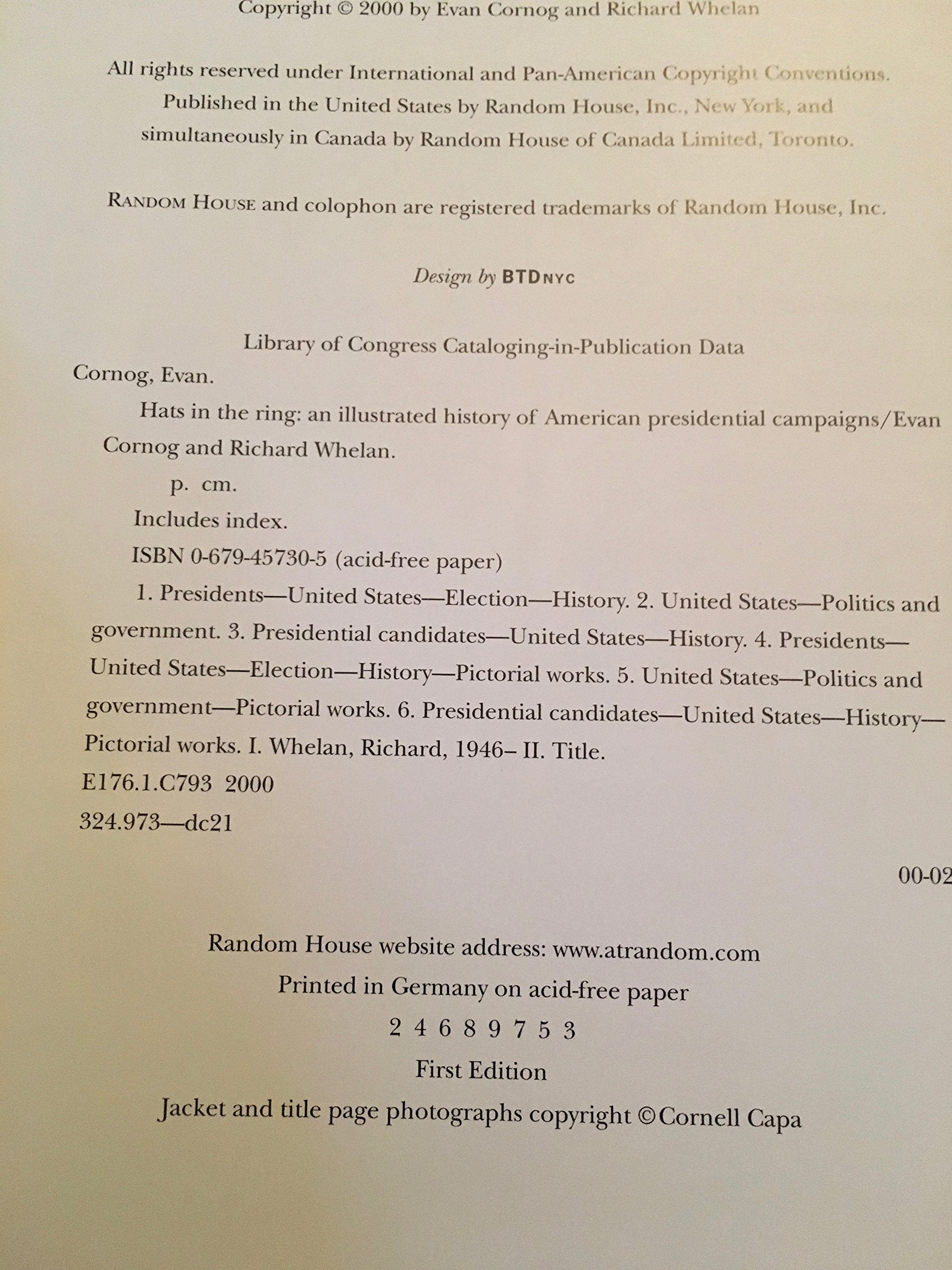 Once every four years, Americans enter into a months-long national spectacle, one with bitter battles, high drama, often hilarious blunders, and, ultimately, a victor to whom we entrust the leadership of our country. It is a process integral to the American ideals of freedom and democracy, and each election reveals a tremendous amount about where and who we are as a nation. In Hats in the Ring, Evan Cornog and Richard Whelan have created a hugely entertaining, splendidly illustrated history of every election from Washington's to Clinton's. For the first time, all the vibrancy, fanfare, and zaniness of American presidential campaigns come to life in one dazzling volume.