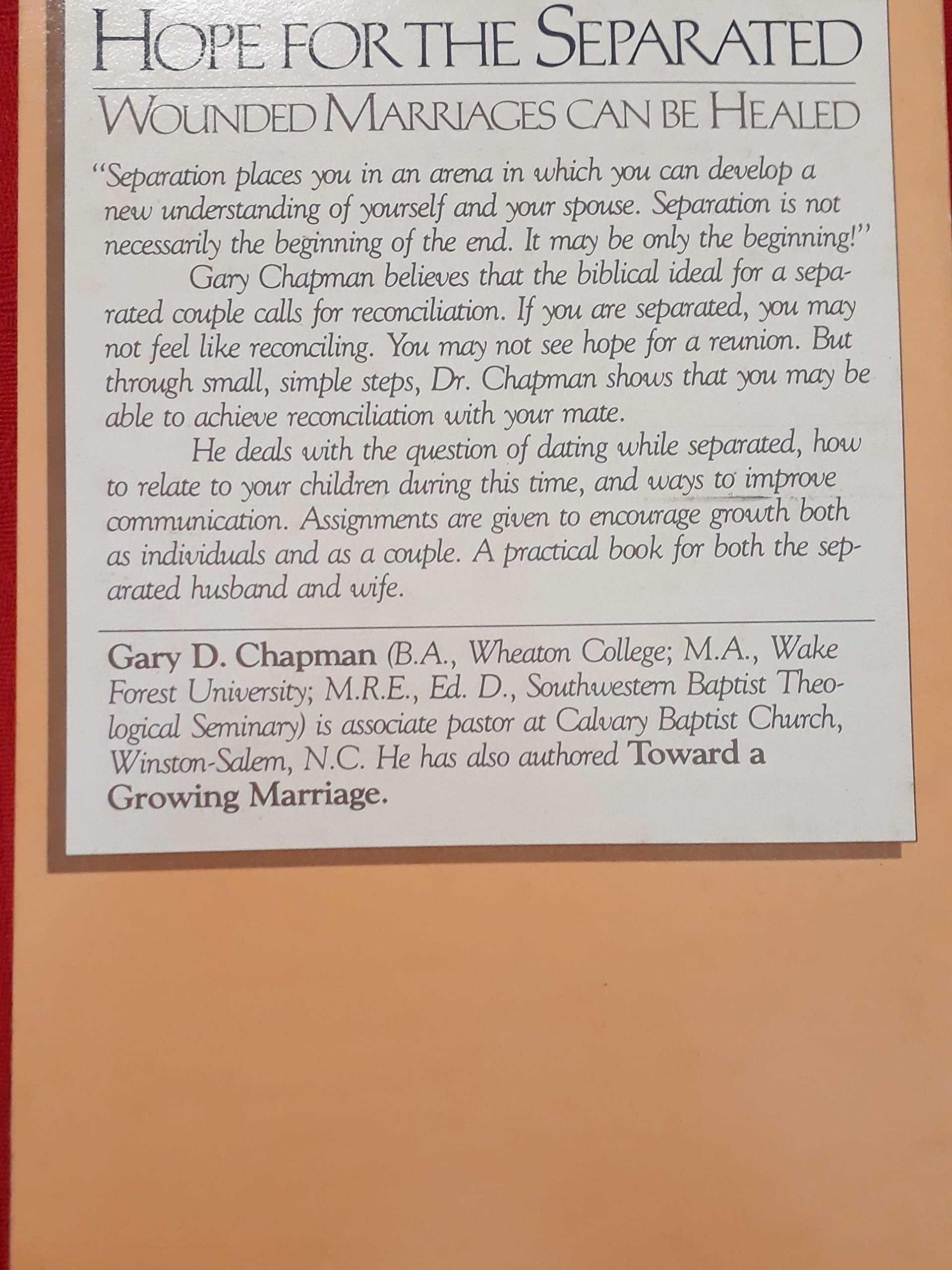 "Separation places you in an arena in which you can develop a new understanding of yourself and your spouse. Separation is not necessarily the beginning of the end. It may be only the beginning! Gary Chapman believes that the biblical ideal for a separated couple calls for reconciliation. If you are separated, you may not feel like reconciling. You may not see hope for a reunion. But through small, simple steps, Dr. Chapman shows that you may be able to achieve reconciliation with your mate. He deals with the question of dating while separated, how to relate to your children during this time, and ways to improve communication. Assignments are given to encourage growth both as individuals and as a couple. A practical book for both the separated husband and wife., ISBN13:9780802436160 ISBN10:0802436161 Material Type:paperback