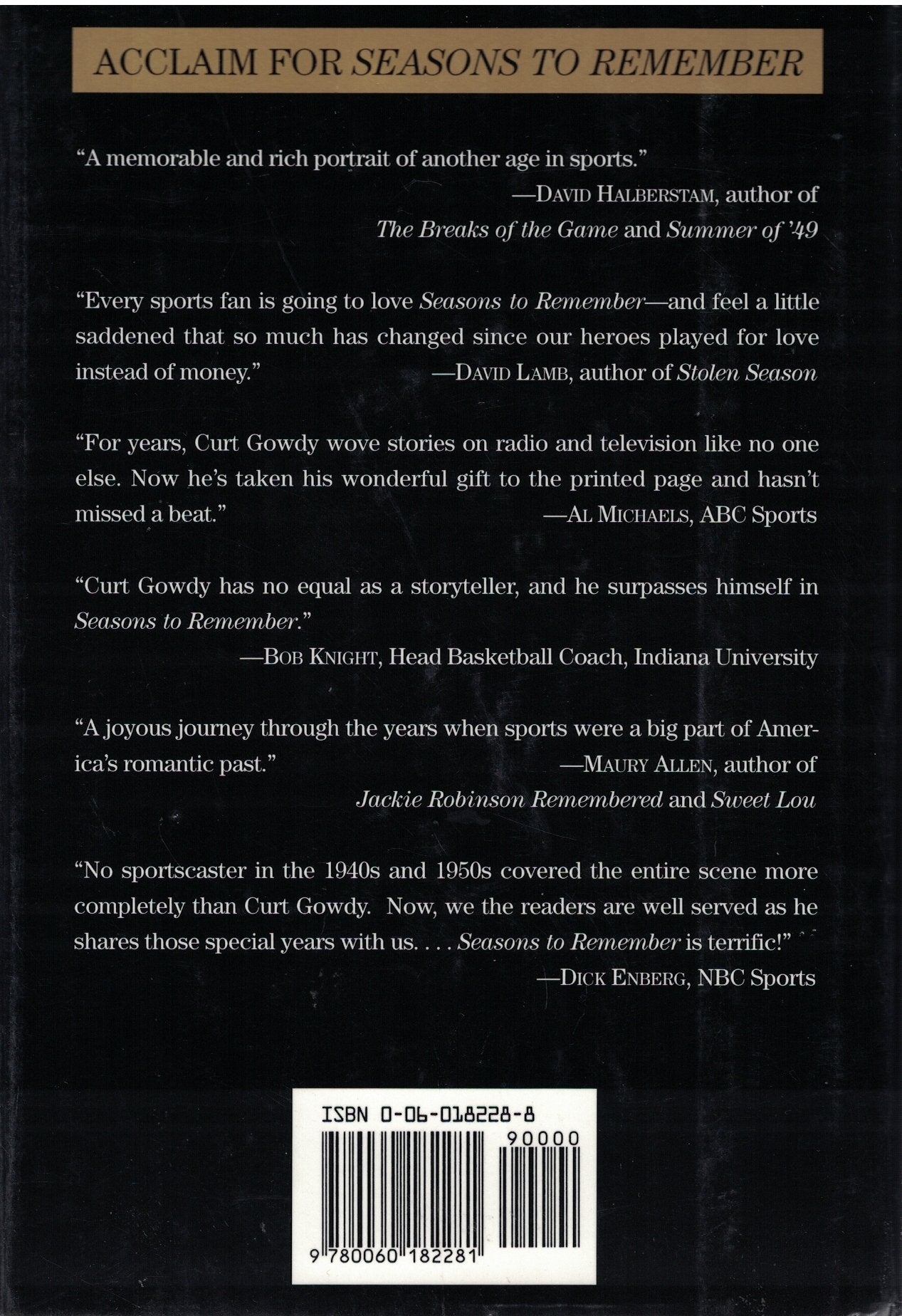One of the nation's most popular sportscasters remembers what American sports were like in the era before big money, television, and drugs. 25,000 first printing. $25,000 ad/promo. Tour., ISBN13:9780060182281 ISBN10:0060182288 Material Type:hardcover