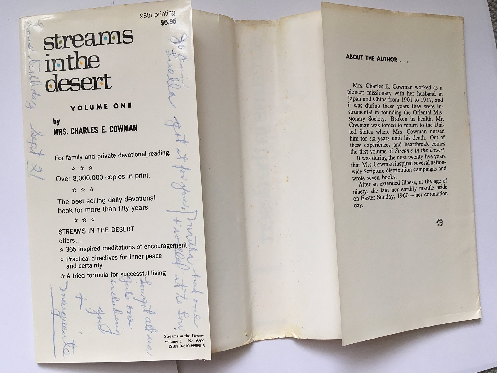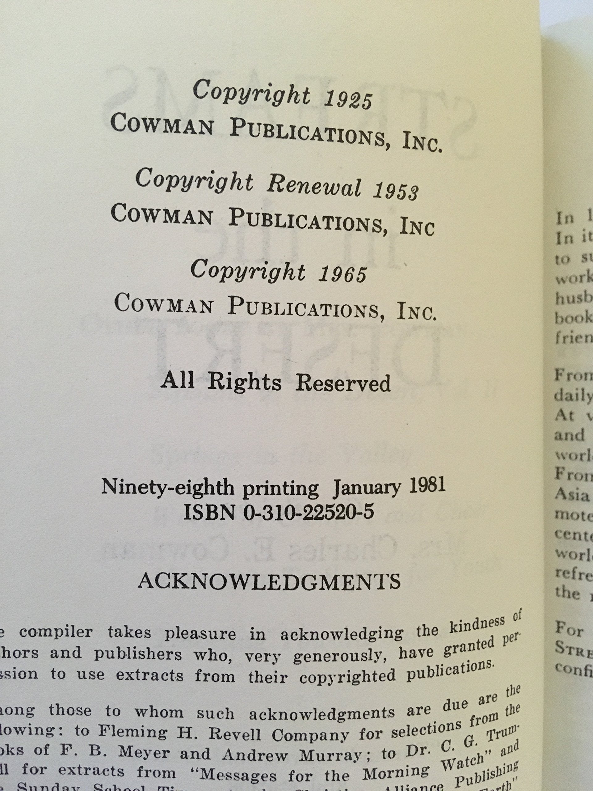 In 1925 the first edition of Streams in the Desert was released. In it were thoughts, quotations, spiritual inspiration which had helped to sustain Mrs. Charles E. Cowman during her years of missionary work in Japan and China--particularly the six years she nursed her husband while he was dying. After two years and three thousand books in print it was suggested to Mrs. Cowman that since all her friends had copies there was probably no need to print any more.