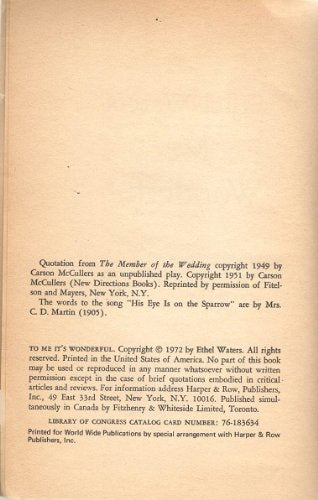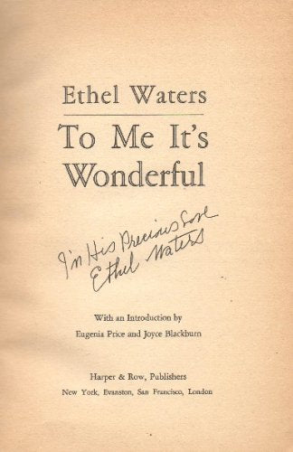 "Ethel Water's own book, set down basically in her own words." Signed by the author, Ethel Waters Publisher: Harper & Row, 1972, ISBN13:B0026QM23Y ISBN10:B0026QM23Y Material Type:paperback
