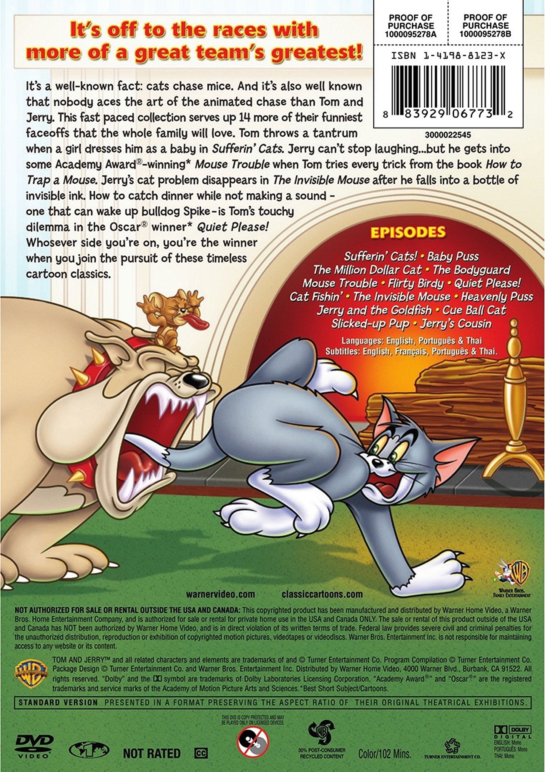 Cats chase mice--it's a simple law of nature--but few have cultivated the art of the chase as skillfully as Hanna Barbera did in their animated Tom and Jerry cartoons in the mid-1940s and early-1950s. Every episode is essentially an extended comedic chase bursting with subterfuge, destruction, and an abundance of action. Tom, the cat, is 100-percent fixated on catching Jerry, the mouse, so when Tom can't seem to prevail in a simple chase, he resorts to a mail-order book for some new techniques that are sure to yield results in the Academy Award®-winning "Mouse Trouble." Unfortunately for Tom, Jerry is uncannily able to outthink even the most elaborate plan. Light is shed on the strangely protective relationship between the bulldog, Spike, and Jerry in "The Bodyguard," and it seems that no matter how hard Tom tries, he will never be able to placate, outsmart, or avoid Spike in the Oscar®-winning "Quiet Please!" or episodes "Cat Fishin'," and "Slicked-Up Pup." Tom suffers all sorts of indignities in this compilation, not the least of which are being dressed up as a baby by a bossy young girl in "Baby Puss" (not "Sufferin' Cats" as listed on the DVD cover) and being challenged by his fellow cats in "Sufferin' Cats," but his cousin Muscles Mouse eventually teaches him to stick up for himself in the Oscar®-nominated "Jerry's Cousin." Even a million dollars can't keep Tom from chasing Jerry in "Million Dollar Cat," but the crafty mouse repeatedly proves impossible to catch, especially in "Invisible Mouse." The birds and the fish gang up with Jerry in "Flirty Birdy" and "Jerry and the Goldfish," a game of billiards proves anything but simple when Jerry's around in "Cue Ball Cat," and "Heavenly Puss" gives Tom a frightening opportunity to reflect on the morality of his actions. Silly cartoon violence abounds in just about every moment of every short, and while it might no longer be deemed suitable for young children, it will inspire smiles and hearty laughter in adults and older children. --Tami Horiuchi
