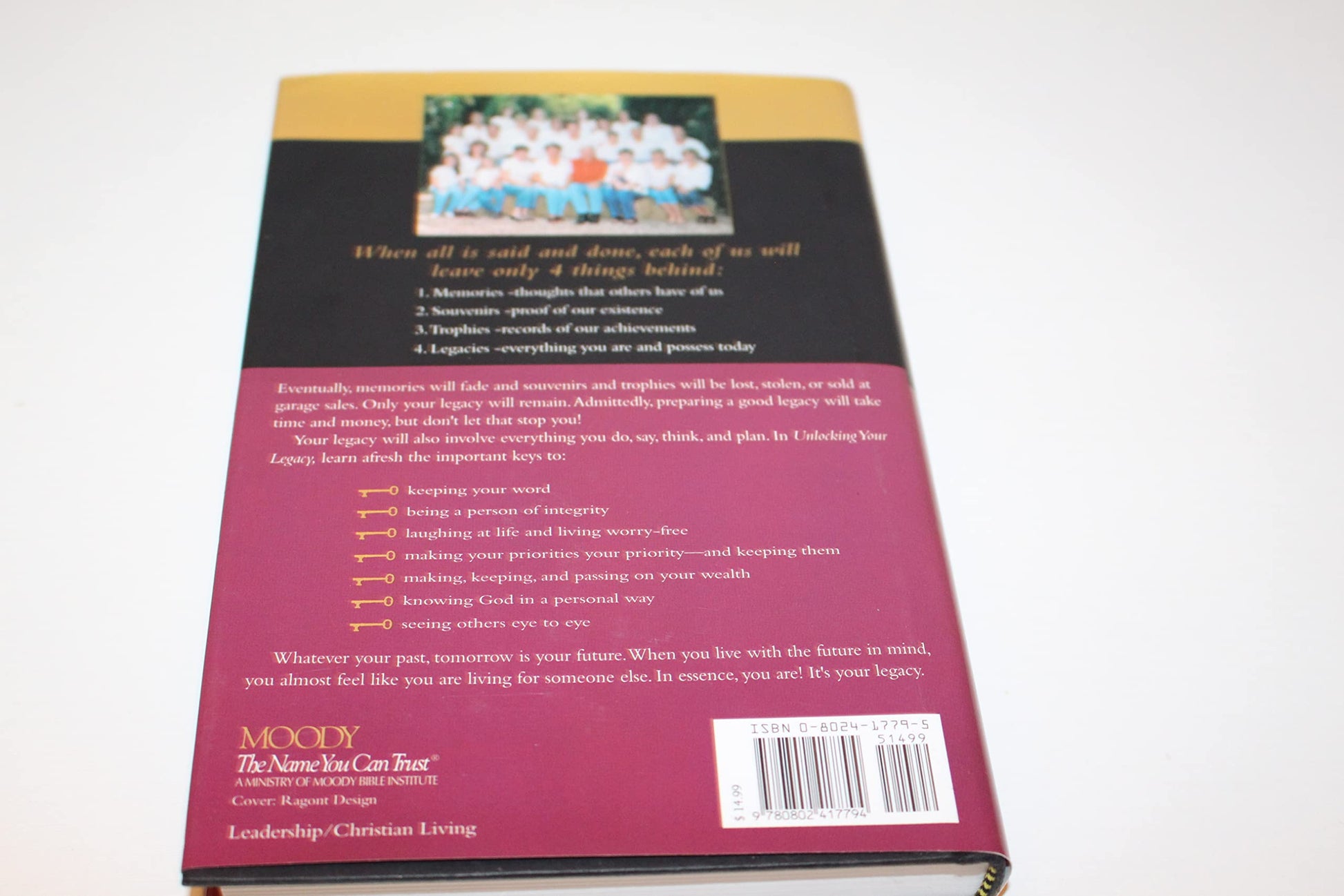 When all is said and done, each of us will leave only four things behind: memories, souvenirs of our existence, trophies of our achievements, and legacies all that we are and possess today. In this exciting book, Paul J. Meyer, a pioneer in the personal development industry, motivates and teaches readers how to begin developing their own legacy that will bless and encourage those left behind., ISBN13:9780802417794 ISBN10:0802417795 Material Type:hardcover